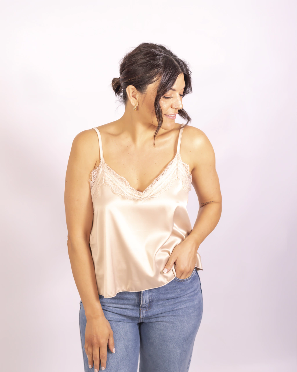 Musculosa lencera confeccionada en satén. Posee breteles finos no regulables y puntilla en escote y sisas. Detalle de dije marcario en espalda.