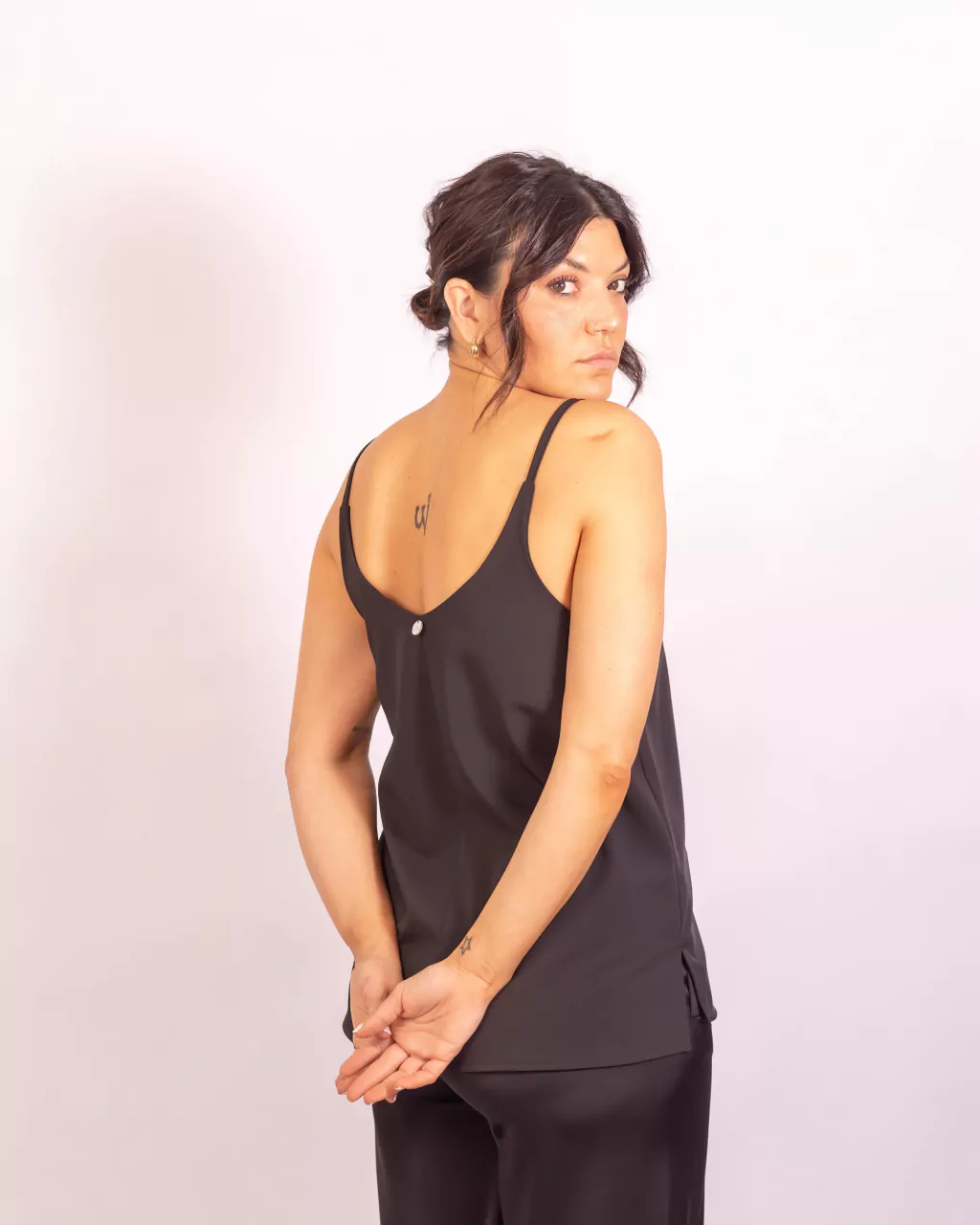 Musculosa de tiras finas no regulables y escote V confeccionada en twill sastrero, un género con peso y acabado mate. Es la pieza que no te puede faltar en tu guardarropas.